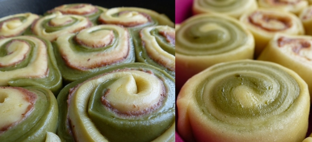l’autre avec des spirales matcha en périphérie et des spirales châtaigne au centre